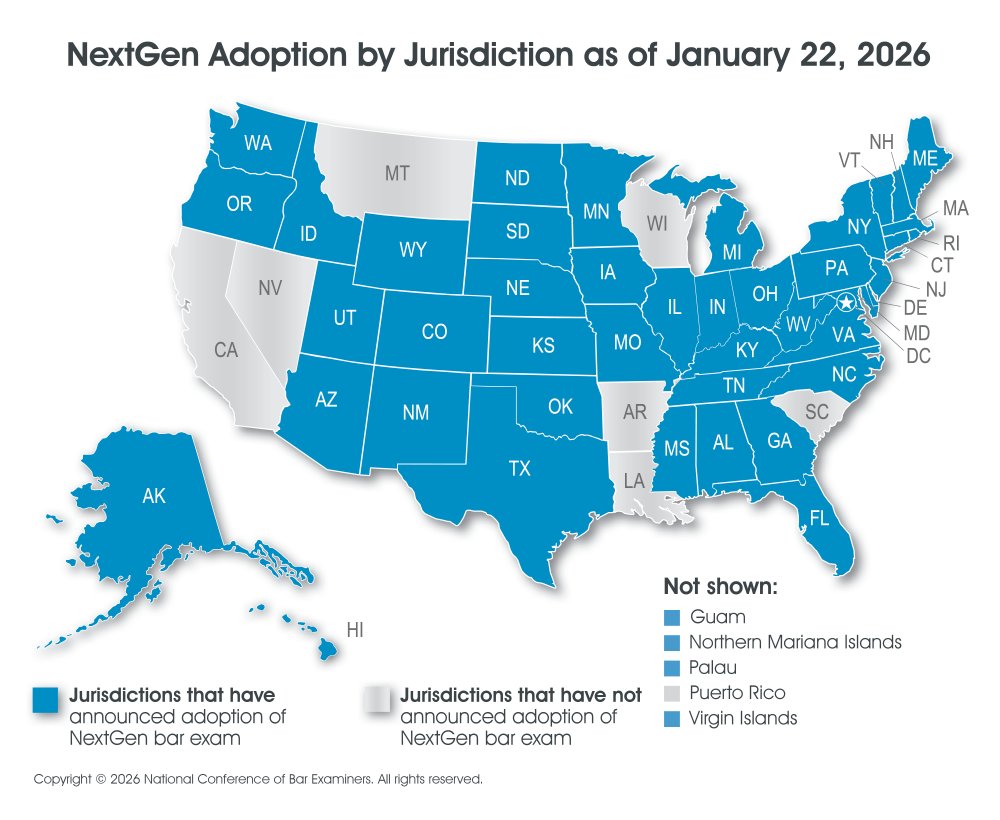 Caption: Map of United States indicating which jurisdictions that have adopted the NextGen bar exam as of January 22, 2026. Visit https://www.ncbex.org/exams/nextgen for an up-to-date list of jurisdictions that adopted the NextGen bar exam. Copyright © 2026 National Conference of Bar Examiners. All rights reserved.
